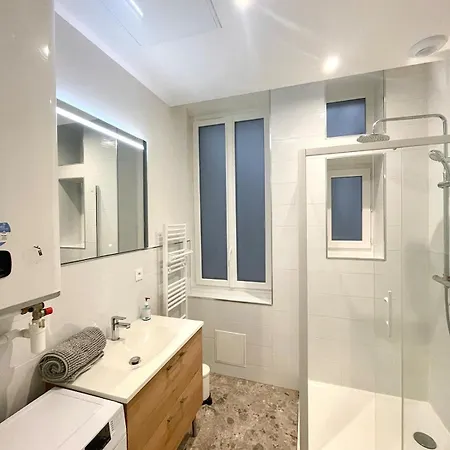 Profitez du confort d'une salle de bain dans les logements Charmant T2 - Clermont Ferrand, équipée d'un sèche-cheveux et des draps de bain. Une douche à l'italienne et une toilette séparée sont également disponibles.